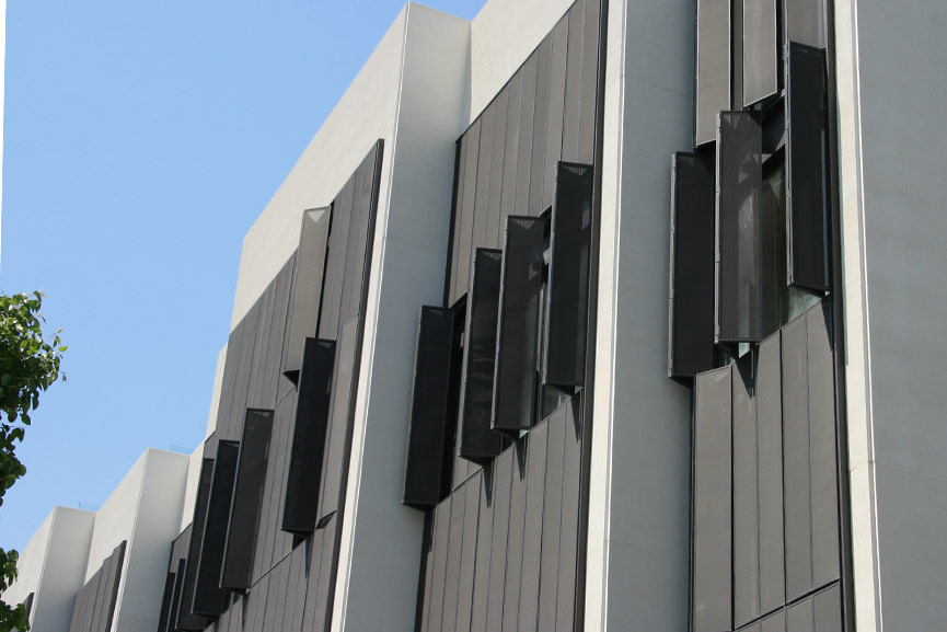 Sistema: Porticones correderos, tipo contraventanas, en metal expandido “deployee” de cobre