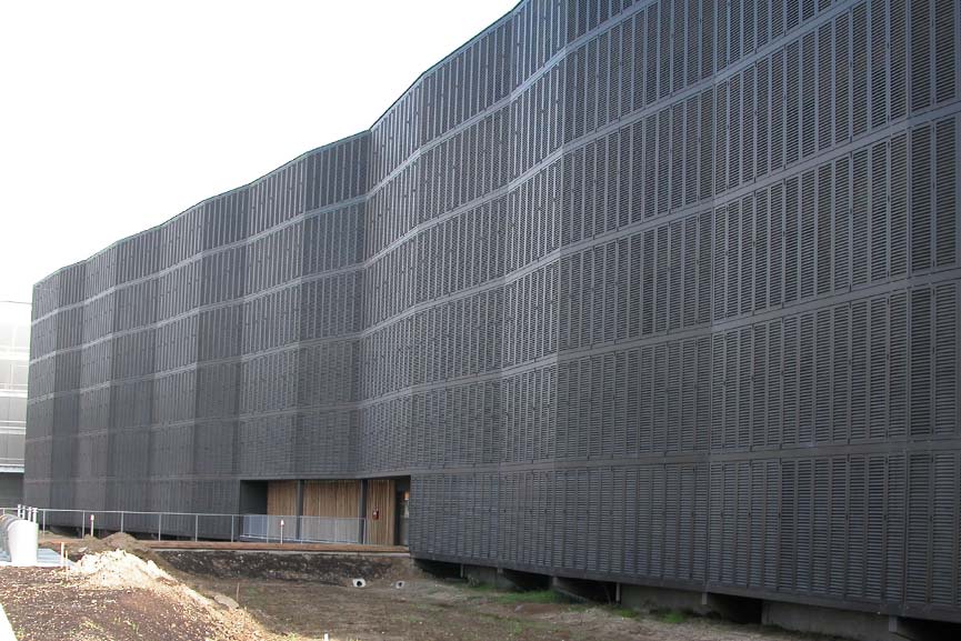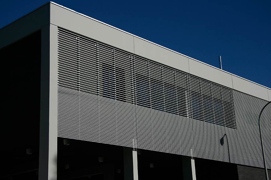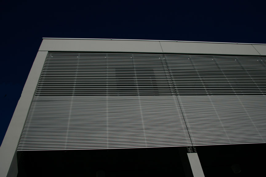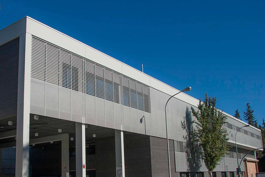 Sistema: 2200m ² de cerramiento con celosías plegables de lamas fijas de aluminio extrusionado