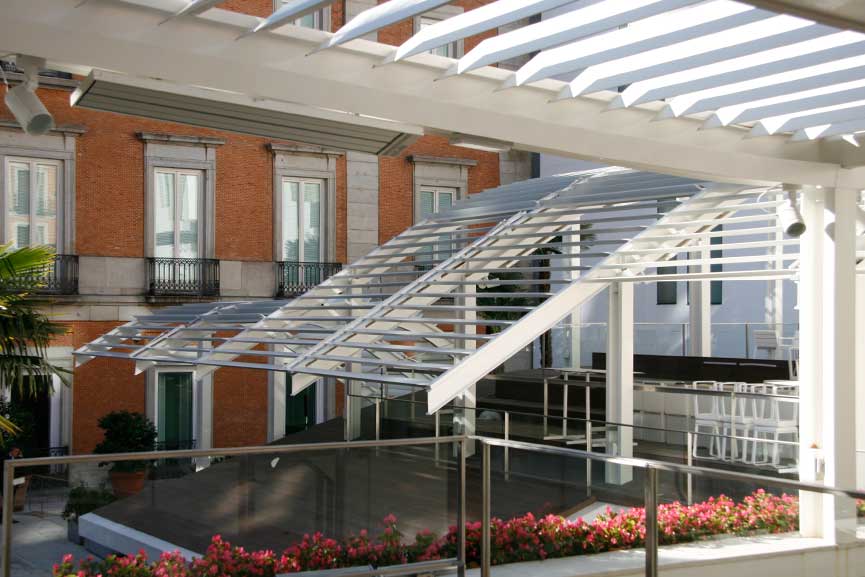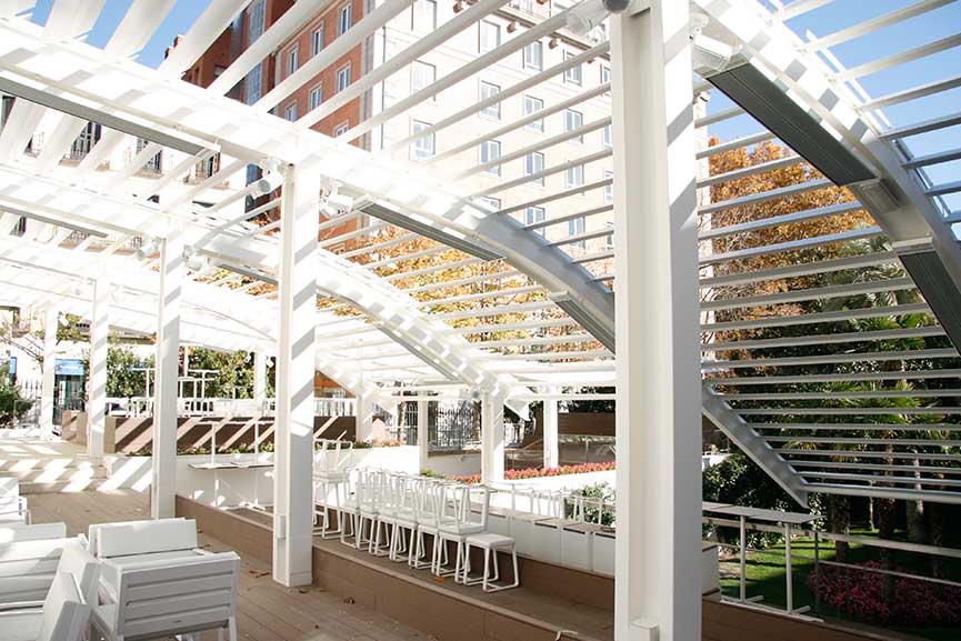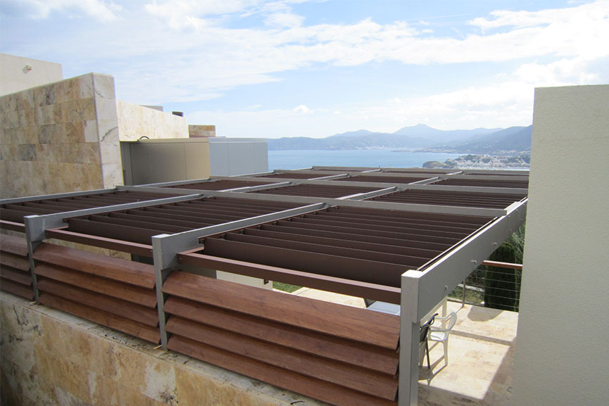 Sistema: Pergola de lamas orientables de aluminio extrusionado, tipo brise soleil, motorizado